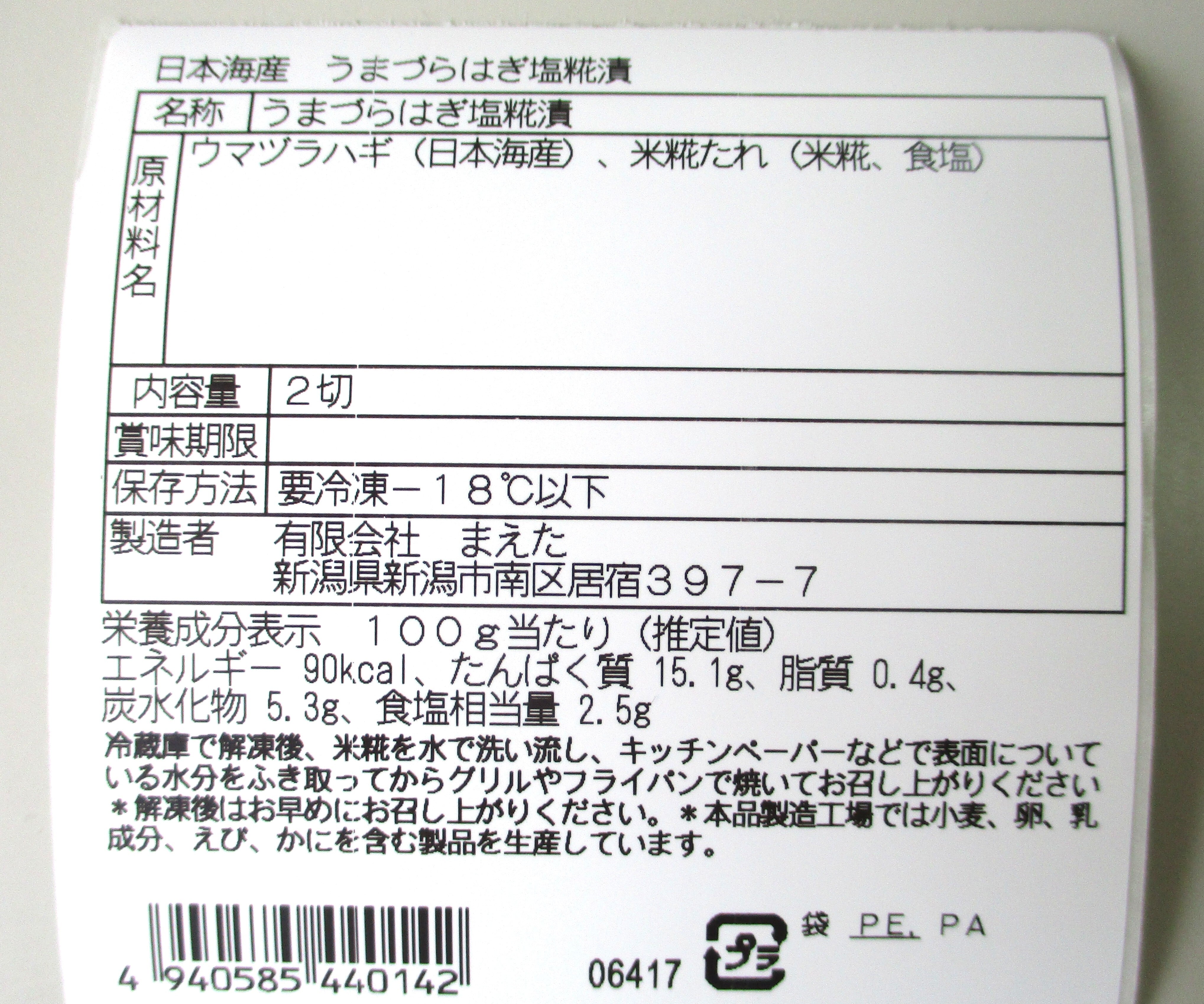 日本海産 うまづらはぎ糀漬2切入